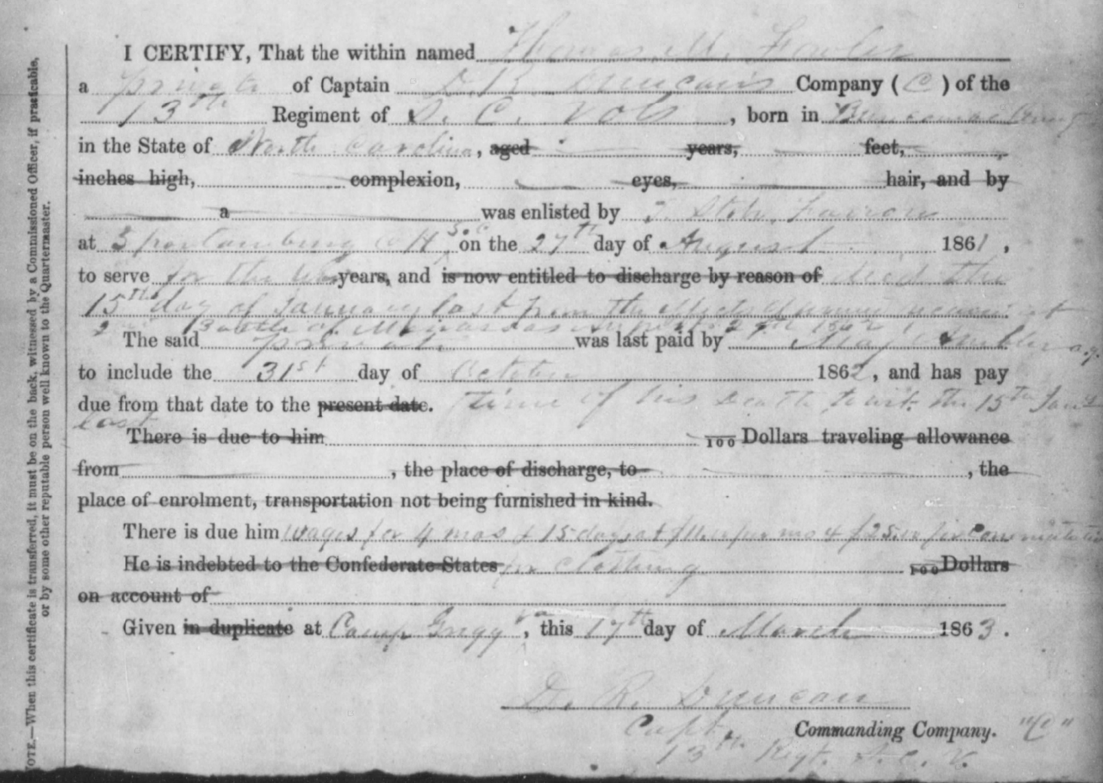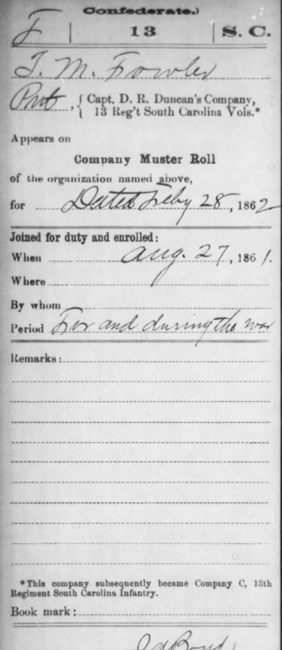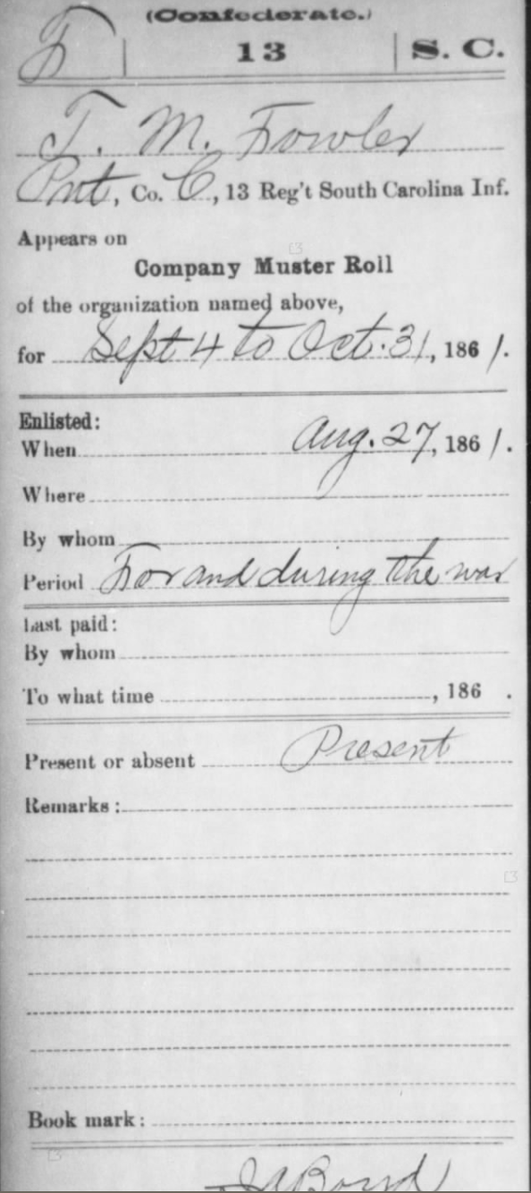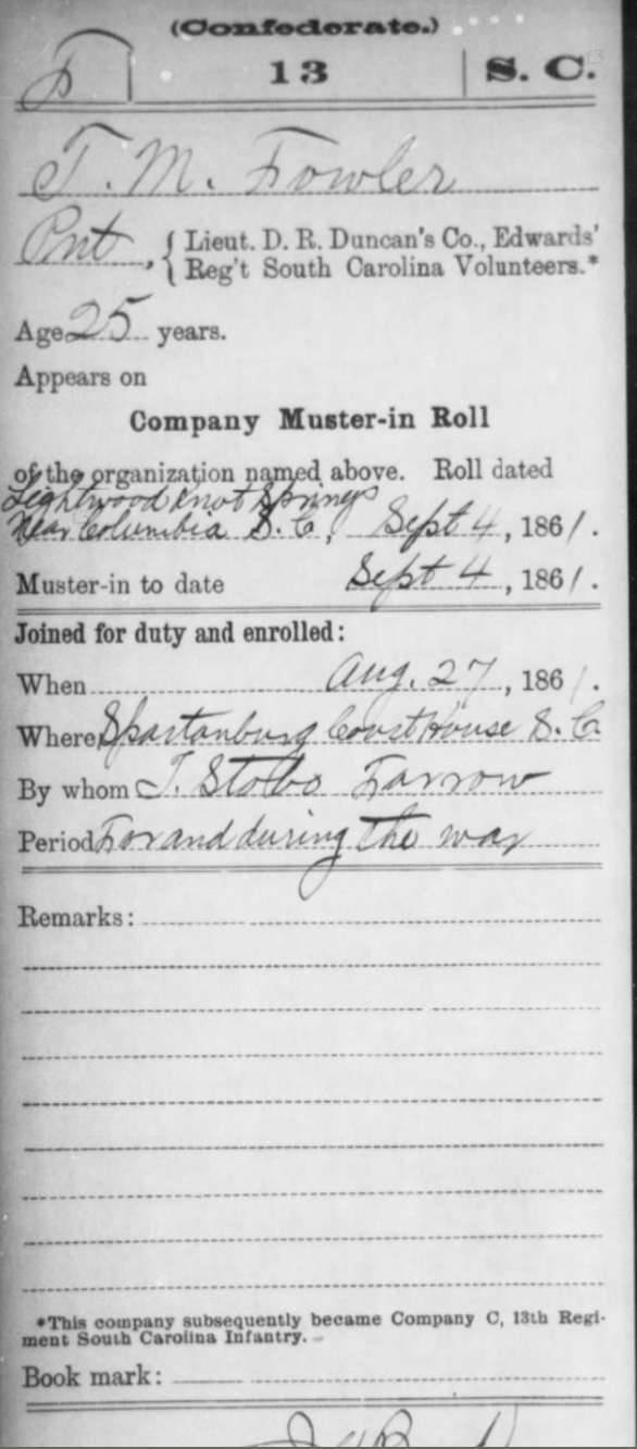 Never mind that the exact location of Thomas M. Fowler in 1860 has not been proven. It is a fact that he was at the Spartanburg Court House on August 27, 1861. He was enlisting in Company C of the 13th South Carolina Infantry.