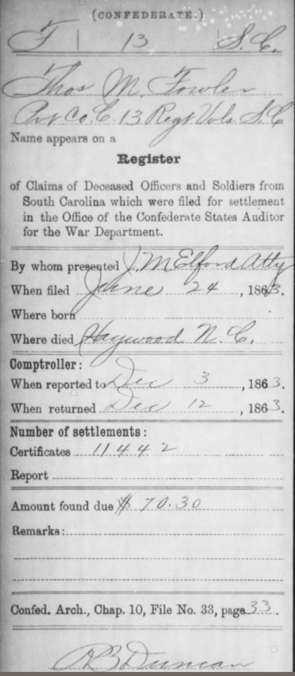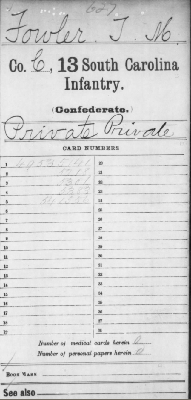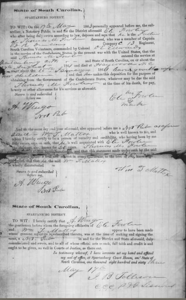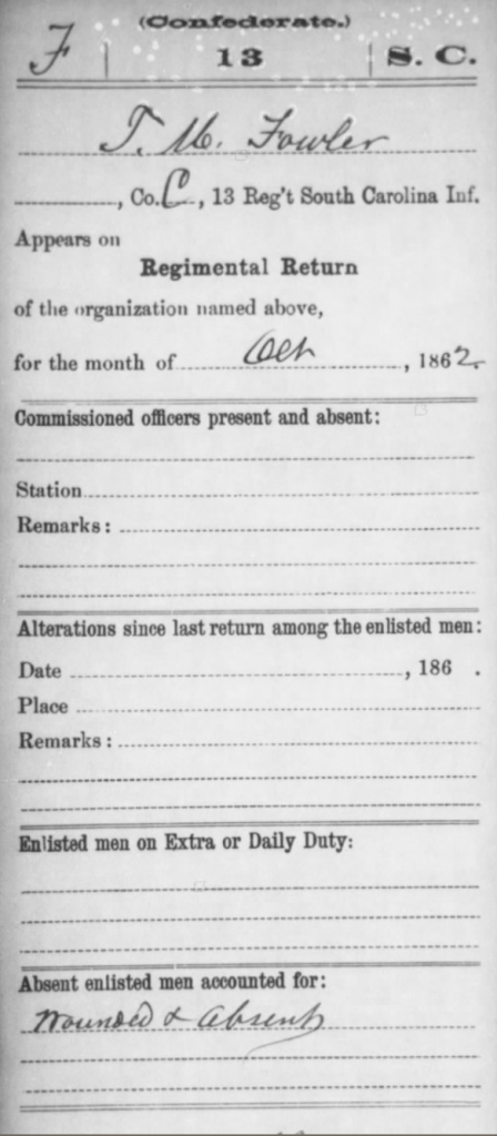 Never mind that the exact location of Thomas M. Fowler in 1860 has not been proven. It is a fact that he was at the Spartanburg Court House on August 27, 1861. He was enlisting in Company C of the 13th South Carolina Infantry.