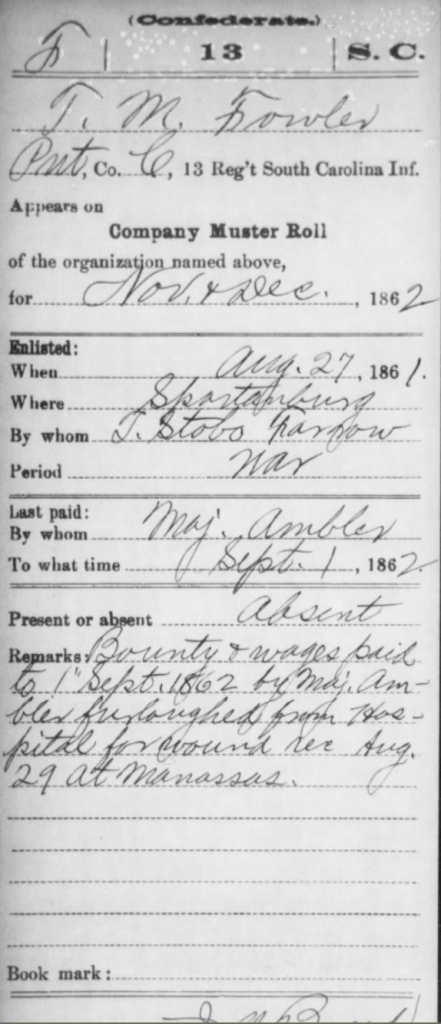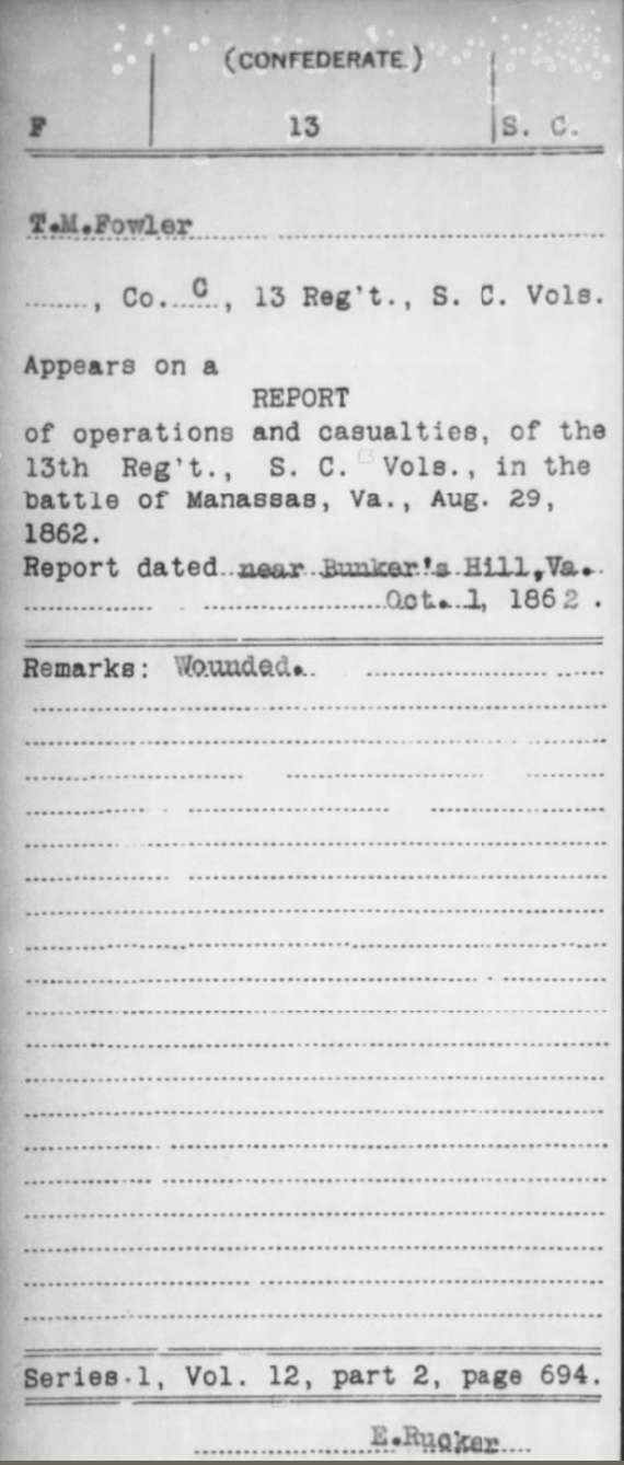 The Second Battle of Manassas was waged August 28-30, 1862. It was a decisive Confederate victory with the Northern Army sustaining almost twice the casualties of the Confederate forces. Still, over seven thousand of the Confederate boys were killed, captured, or wounded in battle. Thomas M. Fowler was one of the six thousand who were wounded on August 29.