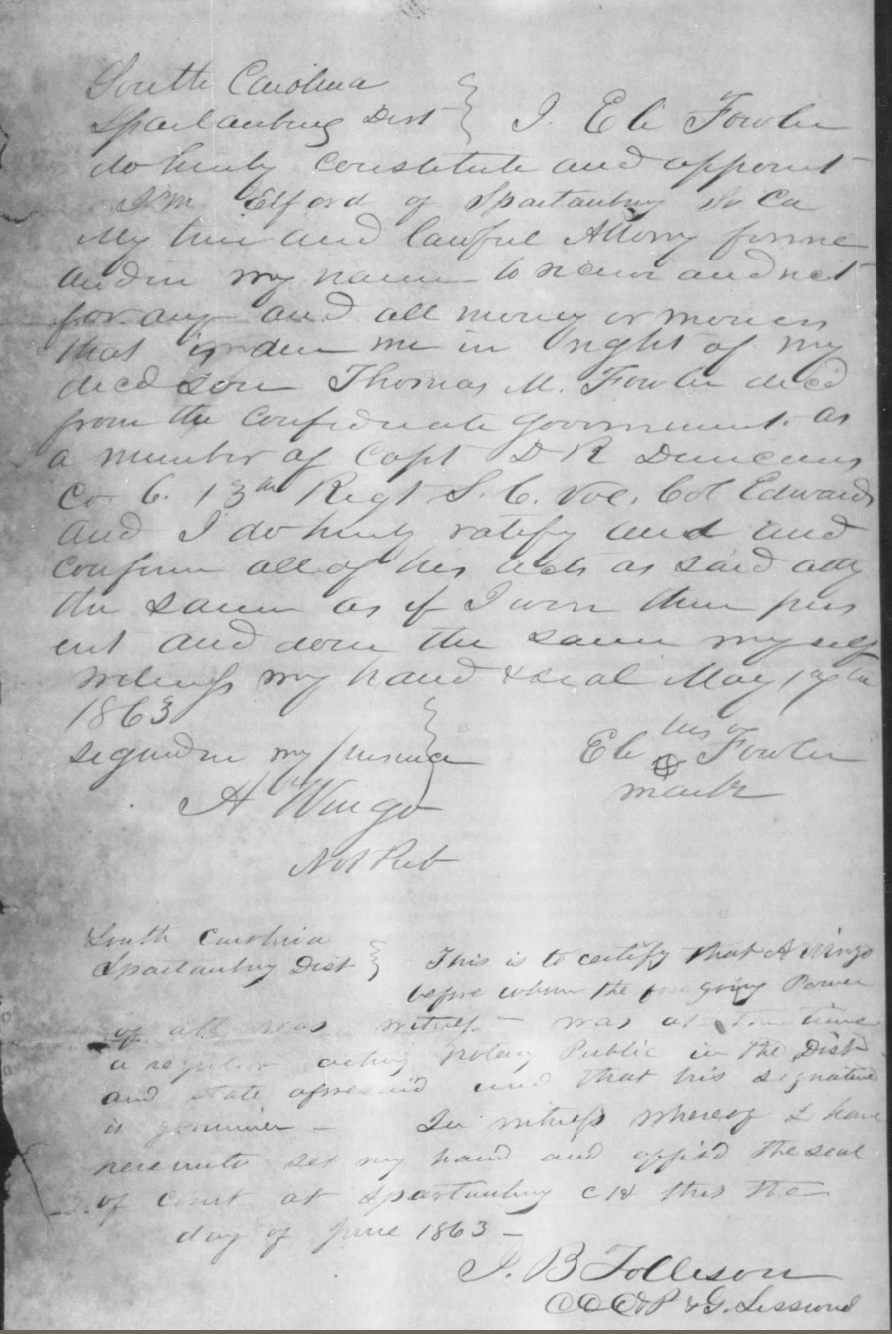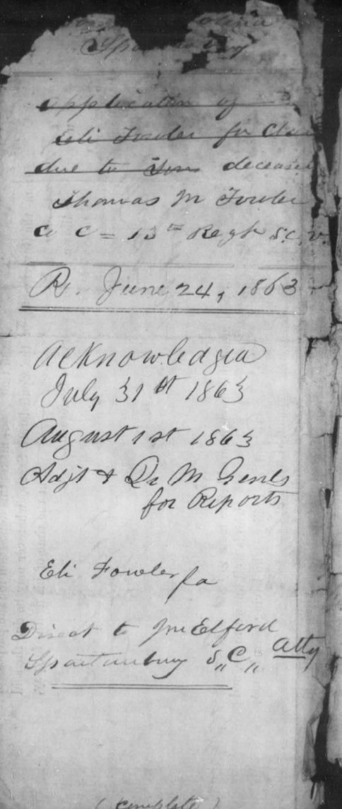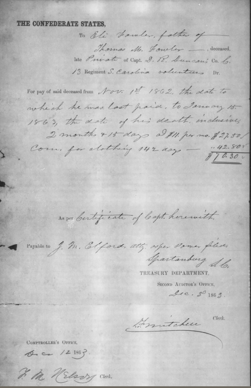 Eli Fowler hired an attorney to collect the money owed to his deceased son for his military service. It was not an easy task for surviving family members to put final affairs in order. There was still a war going on around them and most were in a day-to-day struggle just to survive.