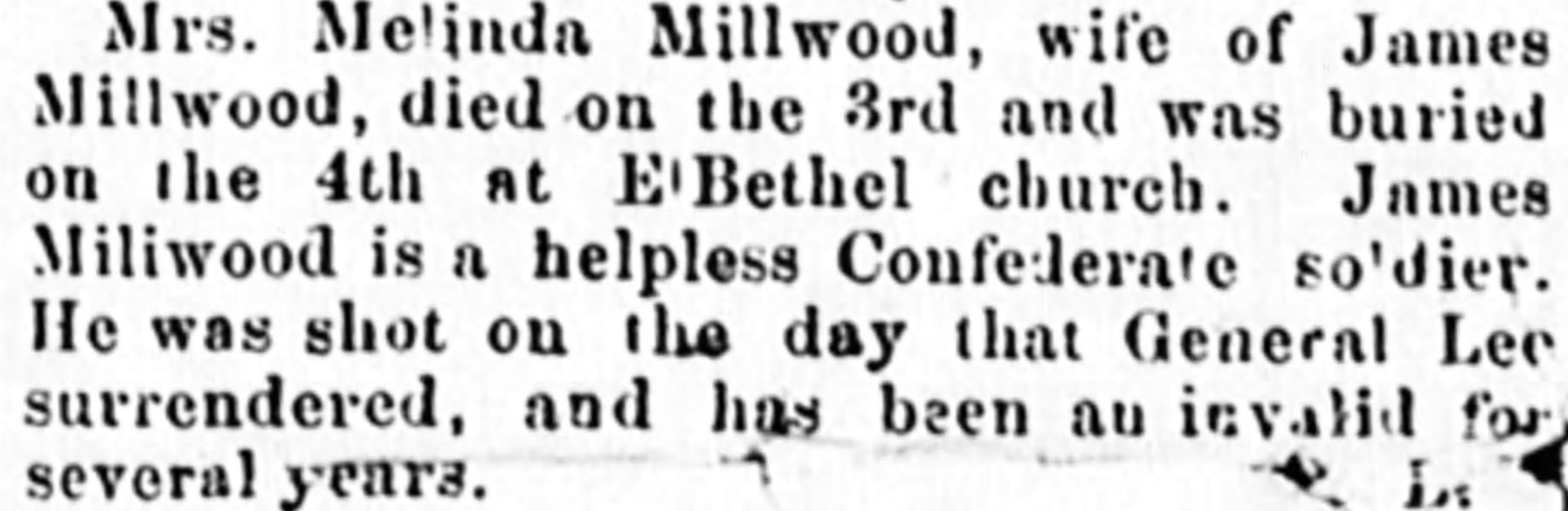 How do I know that I have the correct military records for the James Millwood married to Melinda? A simple clue from his obituary: he received a gunshot wound a short time before the surrender.
