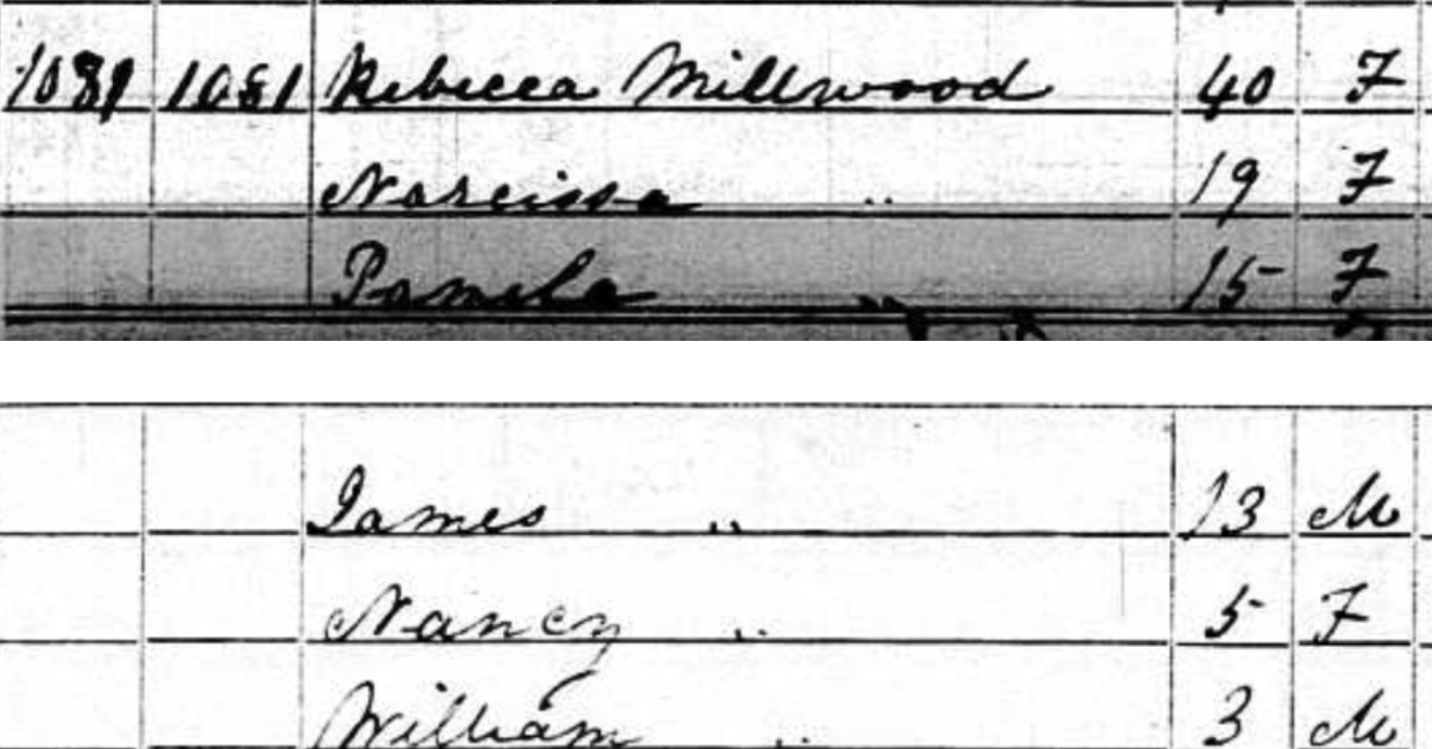 Thirteen-year old James Millwood was in the Rebecca Millwood household of 1850 along with Narcissa and Pamela, and two younger children, Nancy and William.