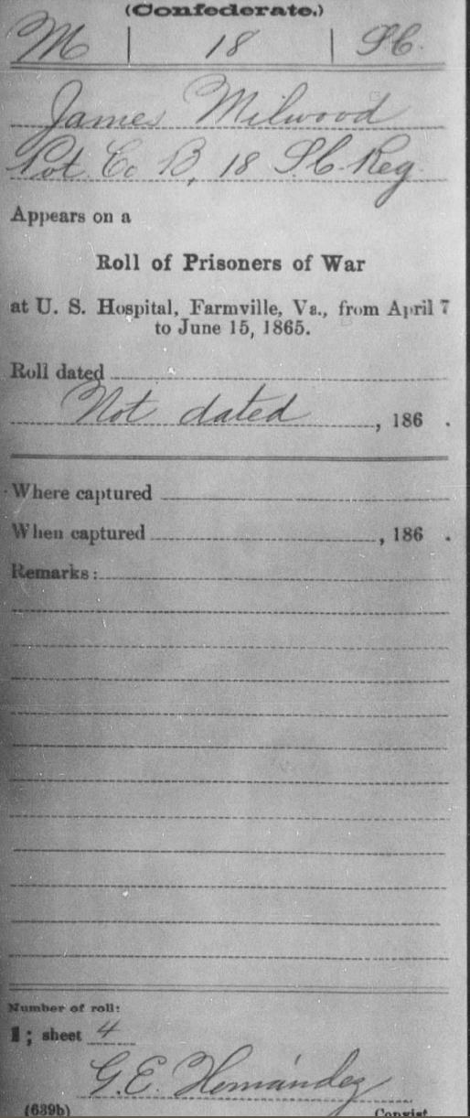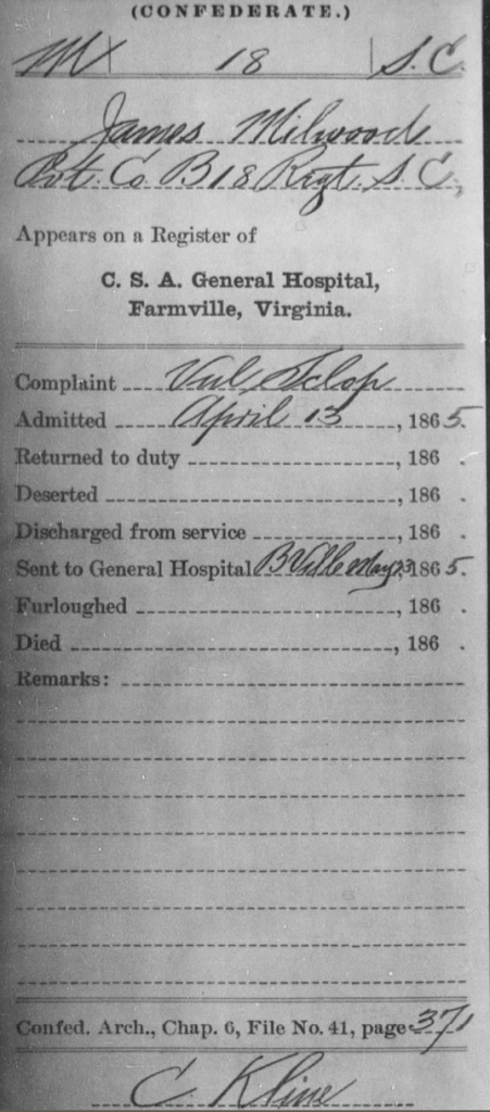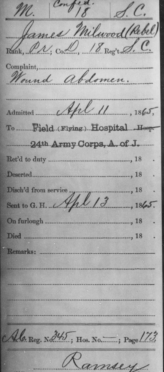 James Millwood was sent to a Field Hospital on April 11, 1865 with a wound in his abdomen. He was transferred to the C.S. A. General Hospital in Farmville, Virginia two days later on April 13, 1865.