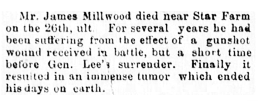 James Millwood had the misfortune to suffer a gunshot wound in his abdomen as the war ended. It is nothing short of a miracle that he survived and made it back home.