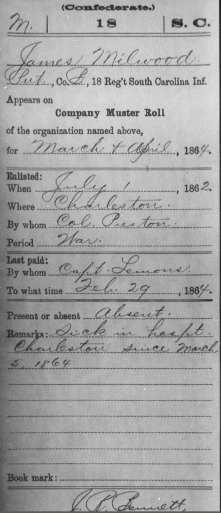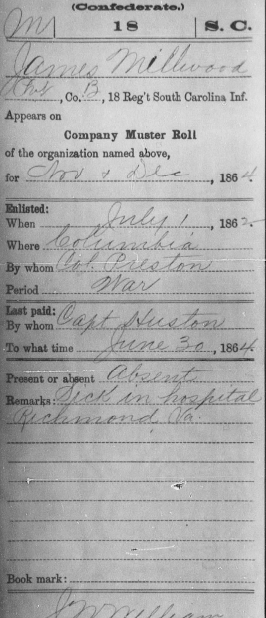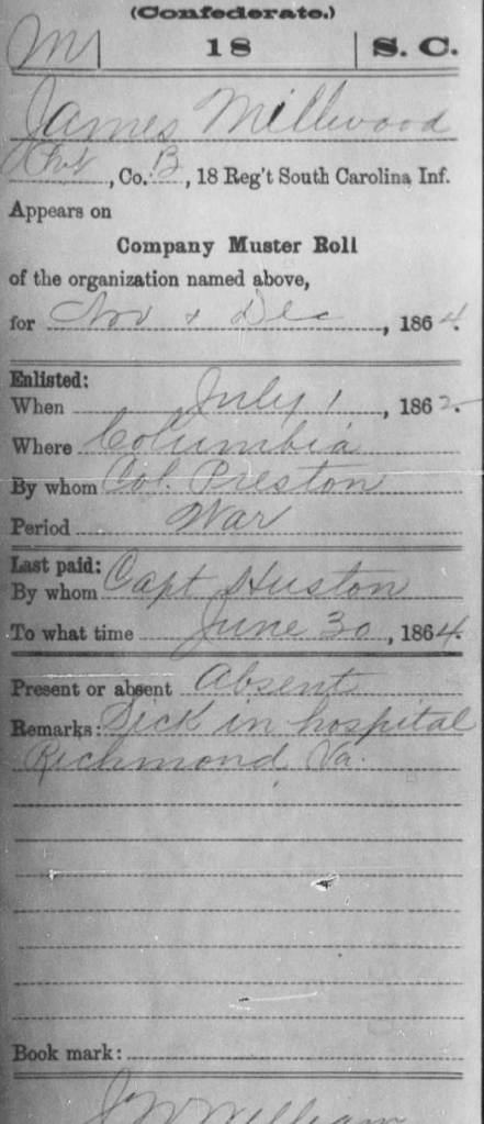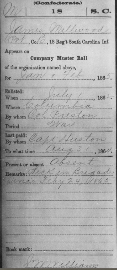 James Millwood –the son of Rebecca and the husband of Melinda — enlisted in the 18th South Carolina Infantry, Company B on July 1, 1862 in Columbia.