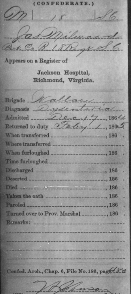 He was admitted into the Jackson Hospital December 17, 1864 until February 1, 1865 for dysentery; and again February 28 until March 22, 185 for fever.