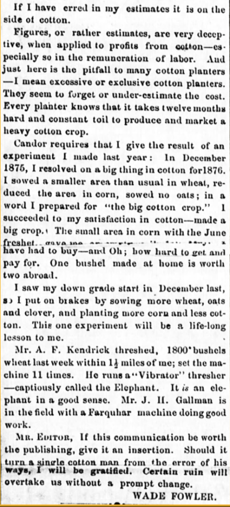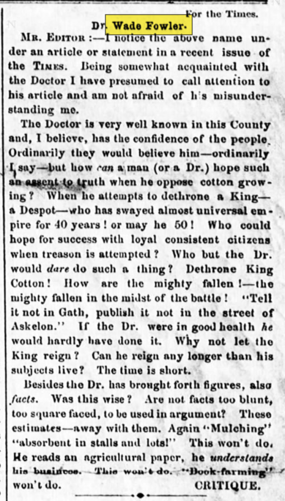 Another letter to the Editor from a critique. If this was a reflection of how the majority of farmers felt about switching from cotton to wheat, Dr. Fowler no doubt lost some respect and popularity from his neighbors.