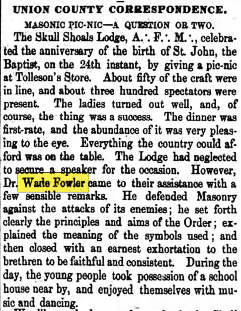 The doctor was involved with the Skull Shoals Mason Lodge. He gave a fine speech outlining the attributes and principles of the Masons at a picnic in June 1869 in front of about three hundred people.