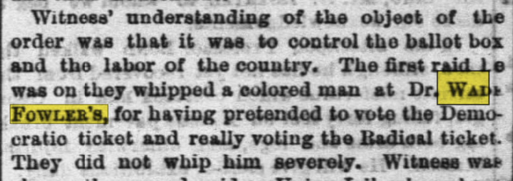 I found a few mentions in old newspapers of Dr. Wade Fowler’s involvement with the KKK. Black men were given the right to vote. The Klan’s attempts to control the ballot box often resulted in beatings and sometimes death. These “punishments” were given to both blacks and whites who did not vote Democratic.