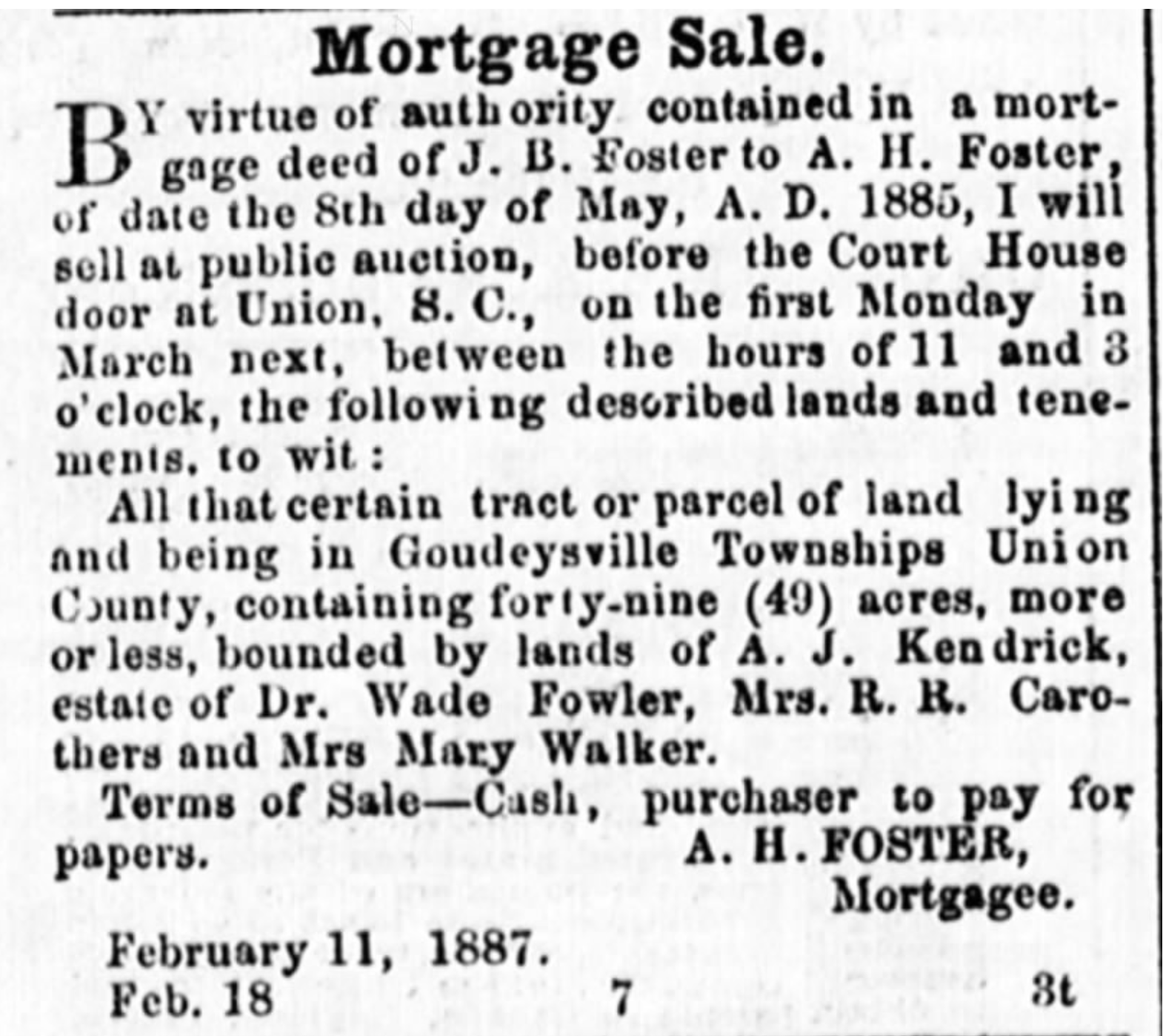Speaking of circumstantial evidence, the mention below of a Mortgage Sale in 1887 links the name of Dr. Wade Fowler and A.H. Foster. It was with Alfred Foster, the merchant, with whom a John Fowler lived in 1870. It is my belief — based entirely on this small mention– that the John Fowler in the 1870 Foster household was John C. Fowler, son of the doctor.