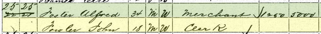 Son John Clark Fowler no longer lived in the household with his parents. I found John Fowler working as a Clerk and living with merchant Alfred Foster in Unionville.