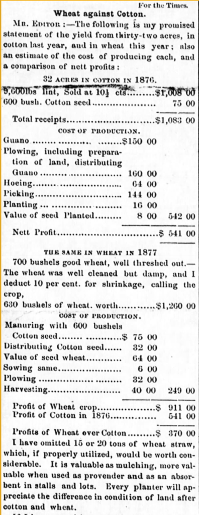 Dr. Wade Fowler wrote a letter to the Editor of the Union Times explaining the benefits of planting wheat rather than cotton. He gave estimates on producing both crops and compared the net profits.