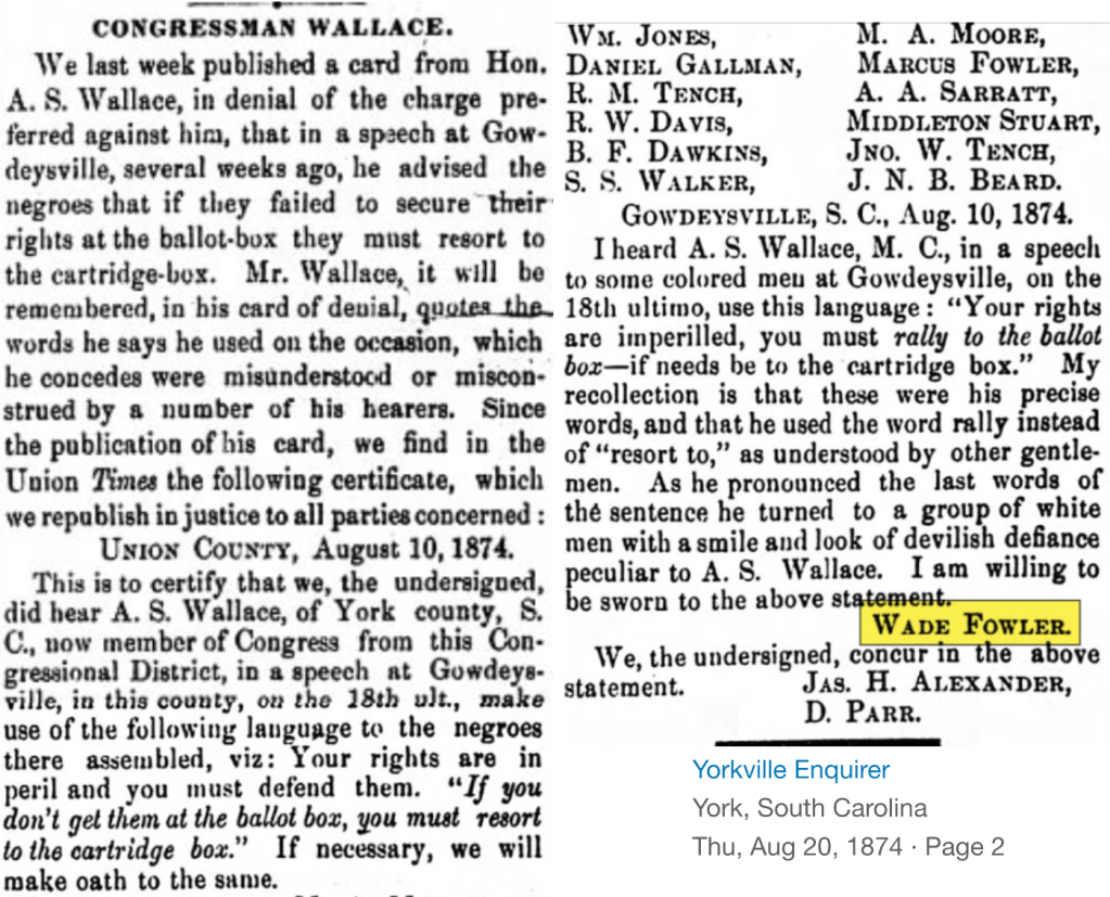 About December 1, 1872, Dr. Wade Fowler was arrested in Union, SC for his KKK activities. He had traveled nineteen miles from home in Gowdeysville, and was arrested in the street.