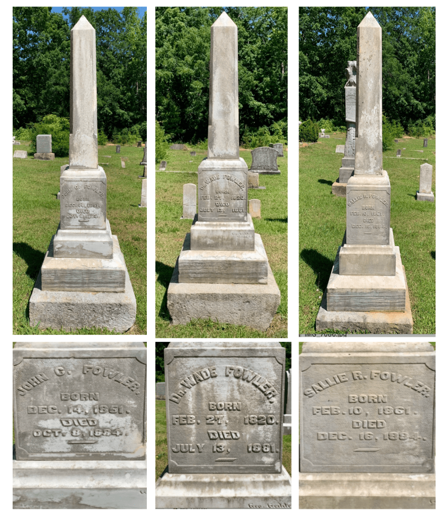 There are three great monuments at Foster’s Chapel Methodist Church Cemetery standing guard over the graves of Dr. Wade Fowler, son John C. Fowler, and daughter Sallie Ross Fowler.