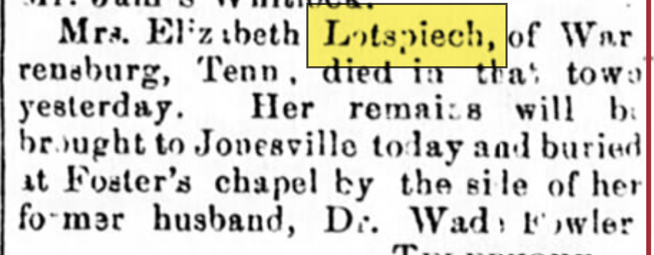 Elizabeth Ann Carothers Fowler Lotspiech died July 23, 1900 in Warrensburg, Tennessee while on a trip with her husband visiting his relatives.