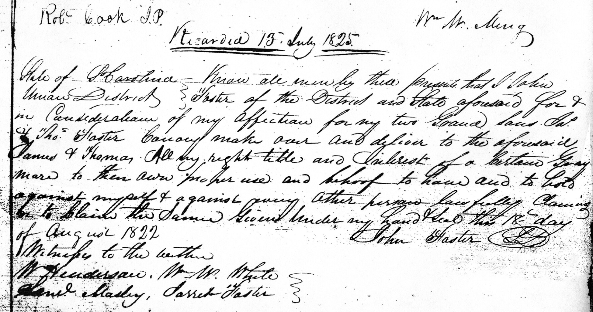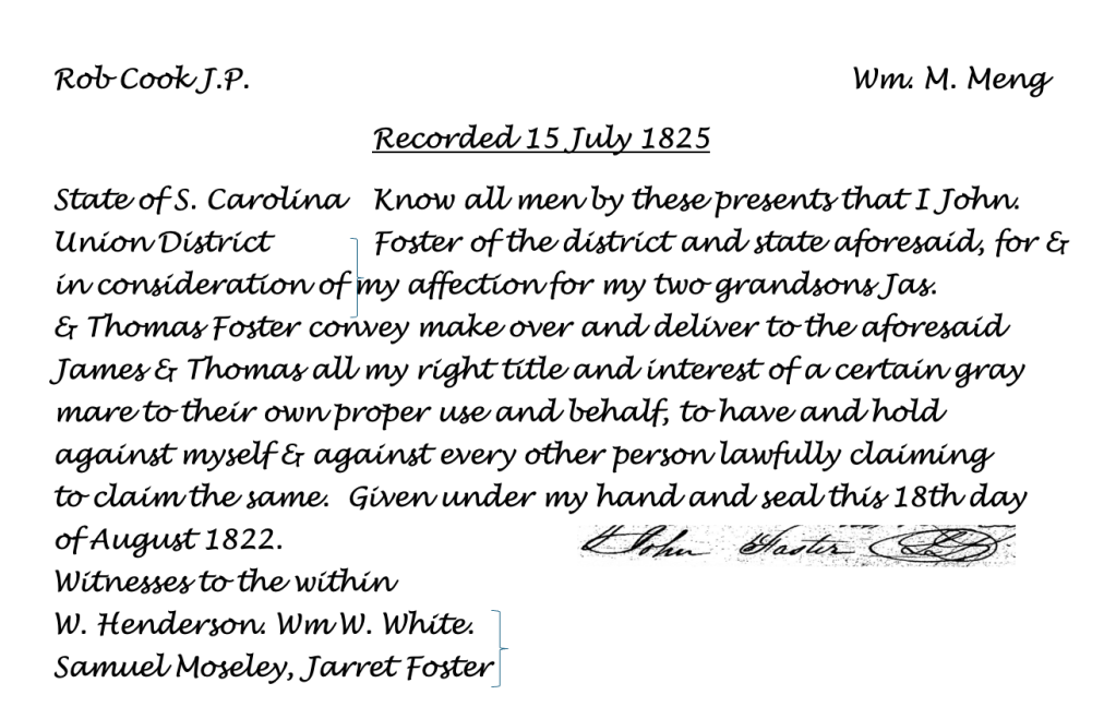 On August 18, 1822, John Foster of Union District gifted his two grandsons — James and Thomas — a gray mare. The document was witnessed by four men, one being Jarred Foster, son of John Foster and uncle to the two boys.