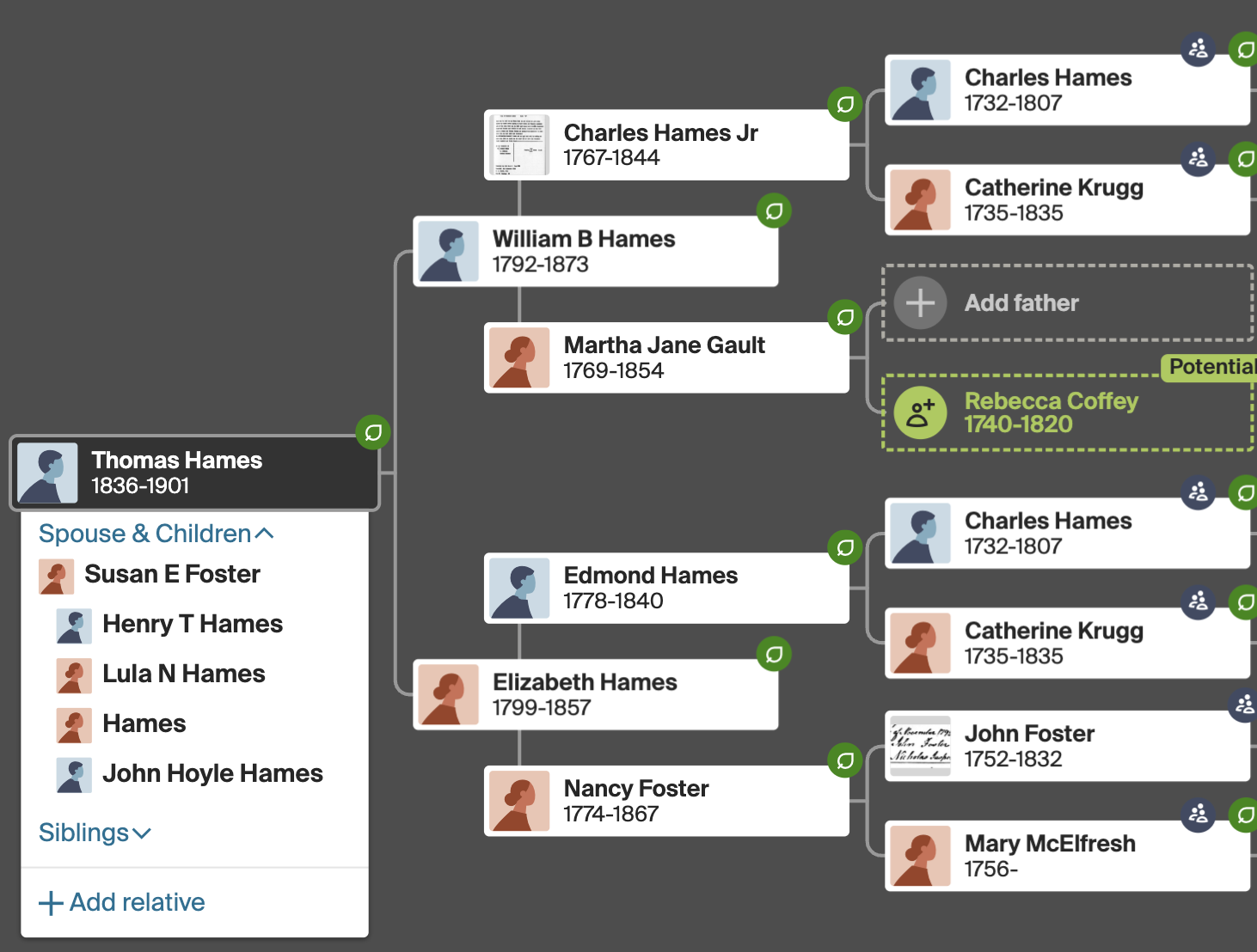 - James Pickens Foster (1813-aft 1880) m. Jane Adaline Prince (1820–1851) undocumented; m. Mary T. Graves (1814-1875) undocumented