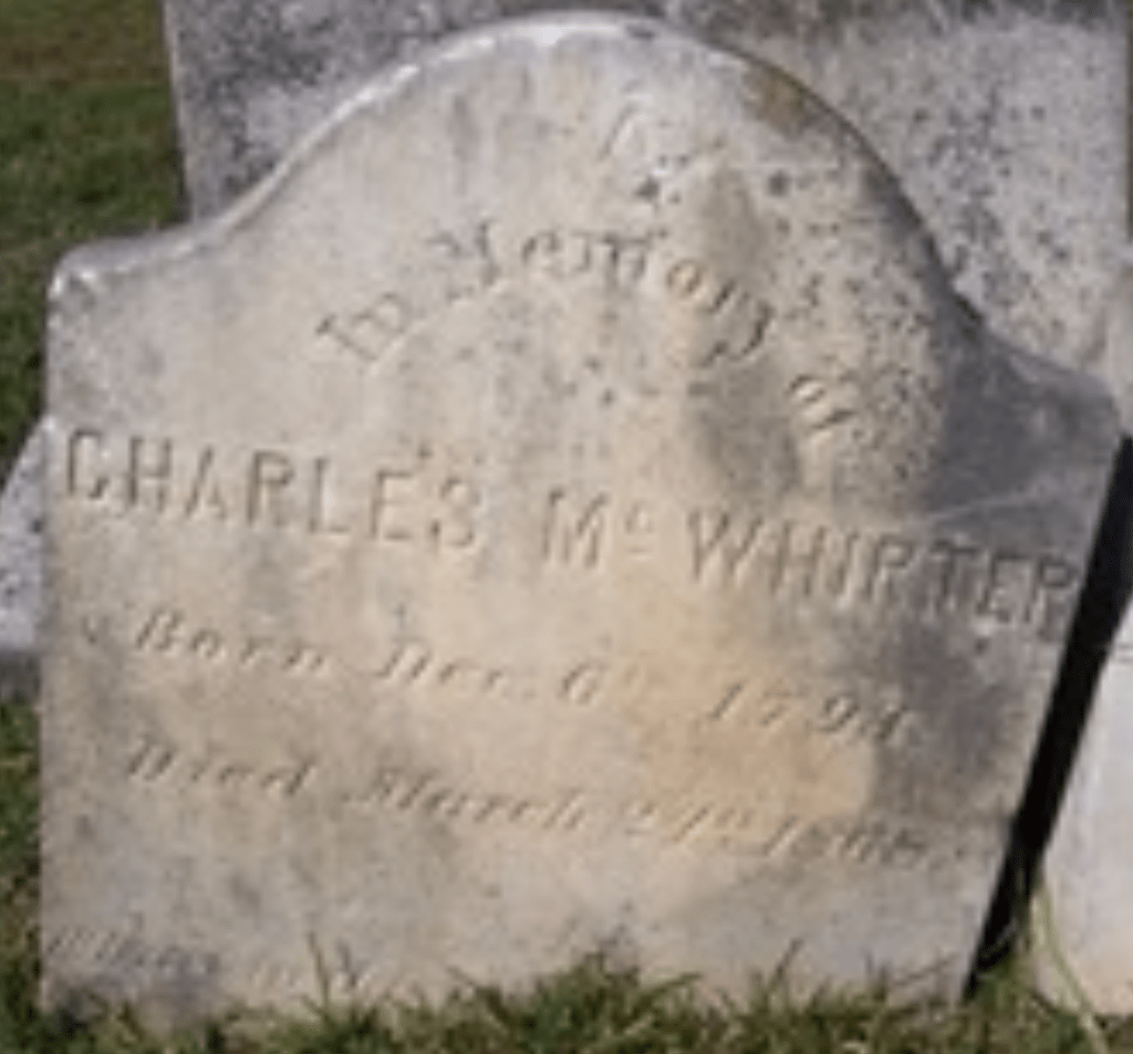 In 1820. give or take a year —Charles McWhirter (b. 1793) had married Elizabeth Fowler (b. 1793), a daughter of Godfrey Fowler (1773-1850), son of Henry Ellis Fowler (1746-1808).