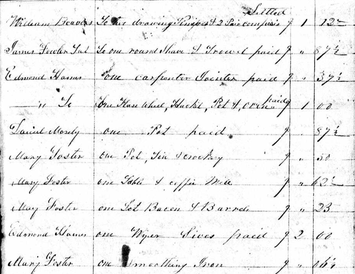 Mary Foster “bought” most of the items at the auction. To be honest, I do not know if she had to actually pay for anything. The words “paid” or “settled” were written on each line containing the buyer’s name, a description of the item, and the sold price of the item. “Paid” and “settled” were never written beside the items that Mary bought.