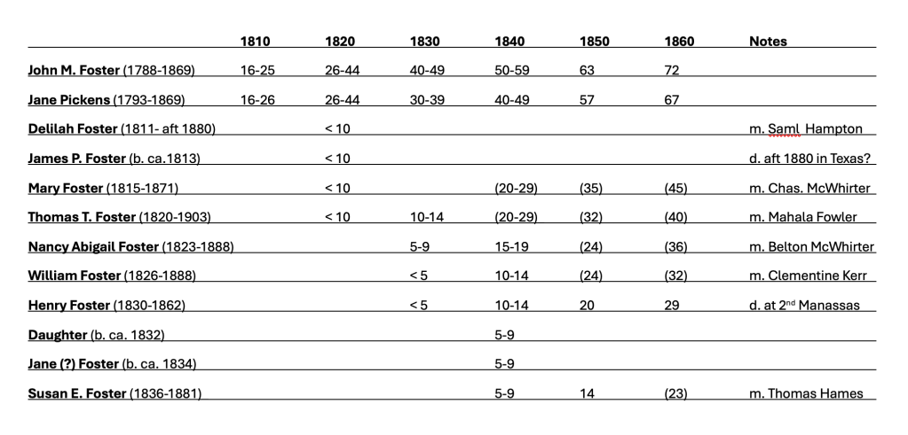 An in-depth analysis of the census records 1810-1860 suggests that John M. Foster and his wife Jane Pickens were the parents of ten children. Six daughters and four sons.