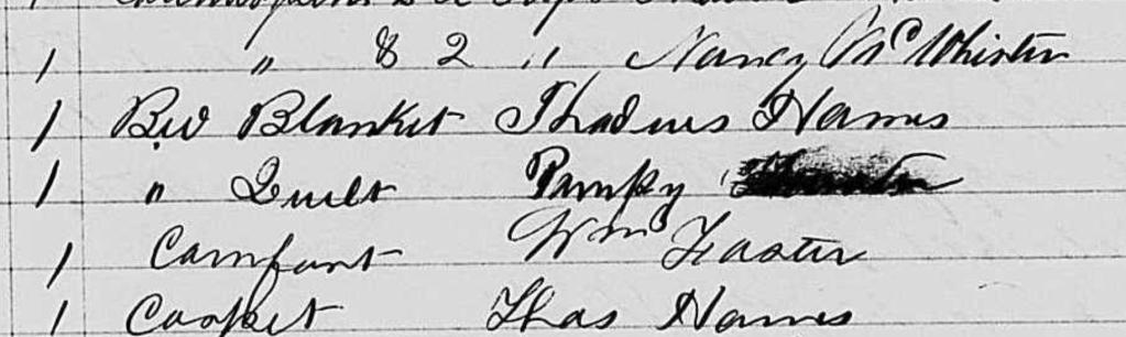 Tucked in among the names of Nancy McWhirter (daughter), Thadeus Hames (relative), William Foster (son) Thomas Hames (son-in-law) was the name Pompey. Someone had written the surname “Foster” which, at some point, had been struck through.
