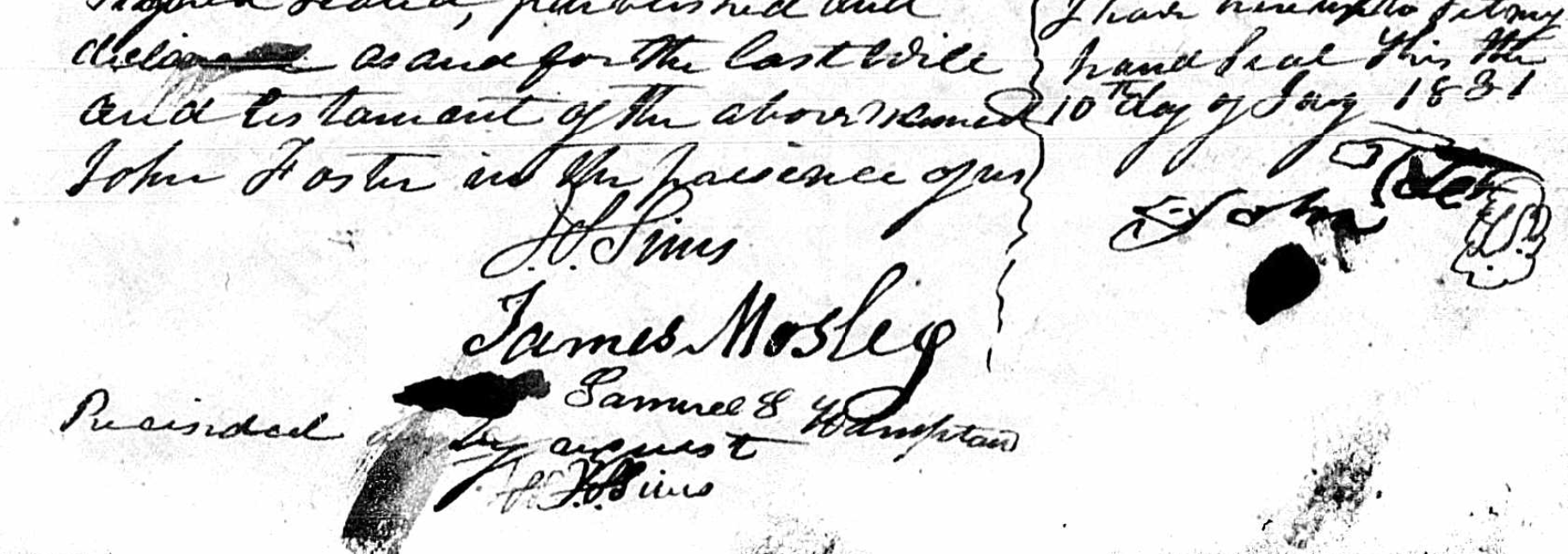 Joseph Stark Sims, James Moseley, and Samuel Hampton — each man served as a witness when John Foster signed his Last Will and Testament.