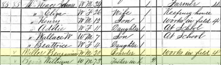 In 1880, William Bevis, now a widower three times, lived with his daughter Eliza Bevis McNease and her family. Benjamin Miller, aged 20, also lived in the household.