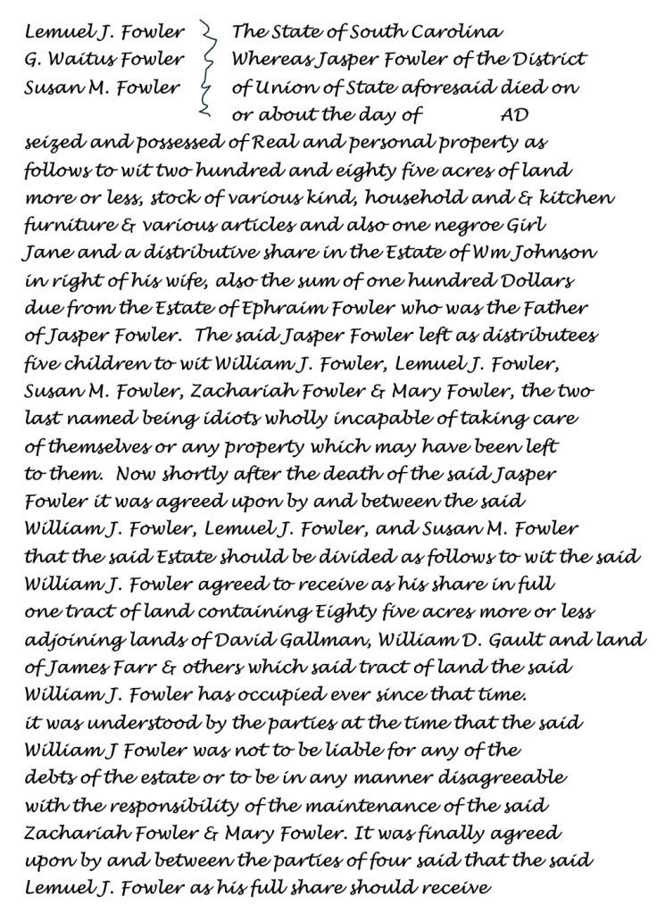 Until today, Susan was the only child of Jasper that I had been able to document. I discovered a document in the Union County Courthouse from 1849, whereas Susan Fowler, daughter of Jasper Fowler, son of Ephraim Fowler sold her 1/8 portion of Ephraim’s estate that she had inherited from her father Jasper to William Bevis. Not only did I learn the name of one of Jasper’s children, I also learned from this document that her father Jasper had died by 1849.