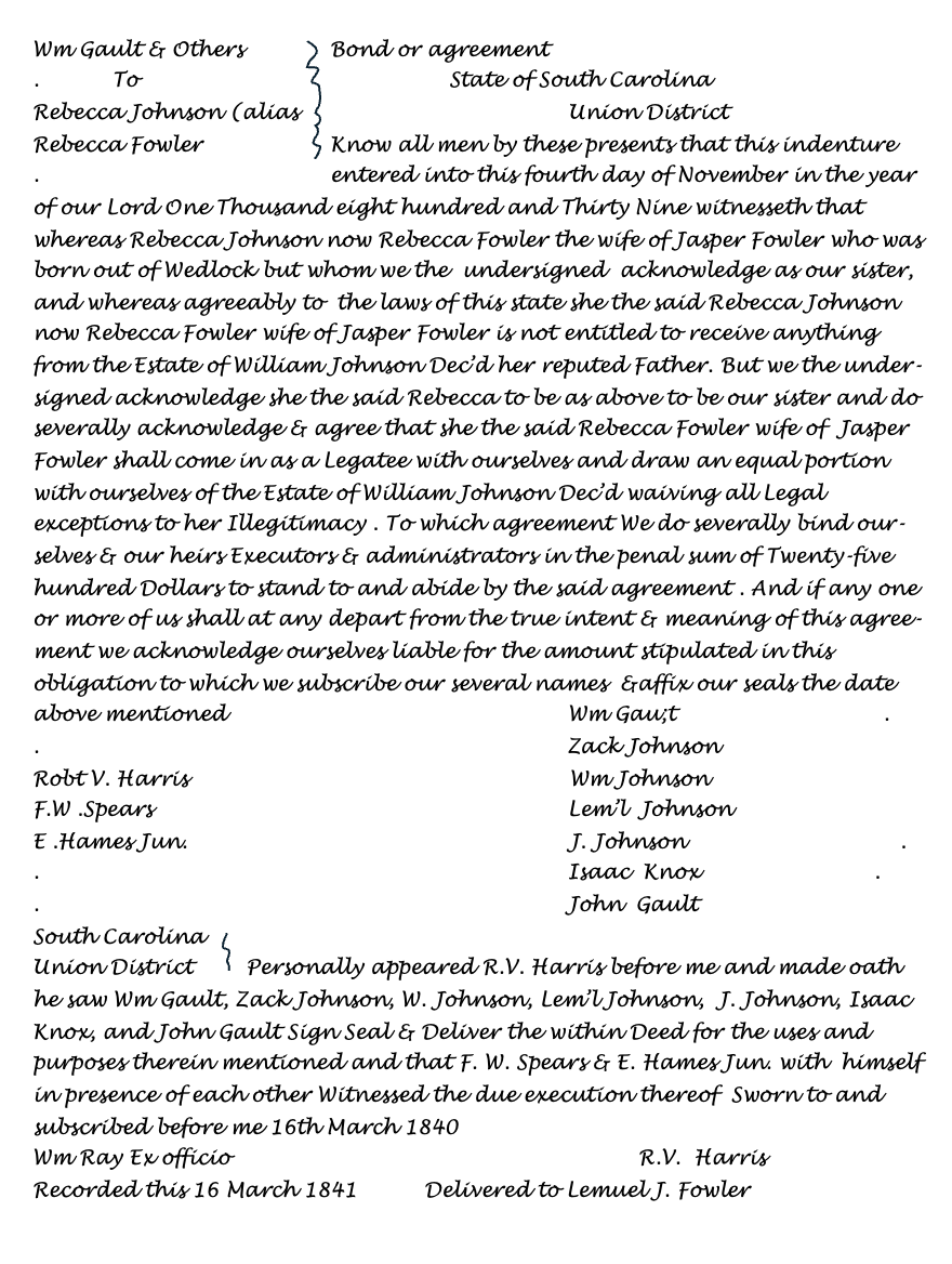 And — finally — another wonderful discovery. The document had been drawn up in 1839, and recorded in 1840. It stated that although she was born out of wedlock, the sons and daughters of William Johnson accepted her as their sister and wanted her to share in the estate of their father.