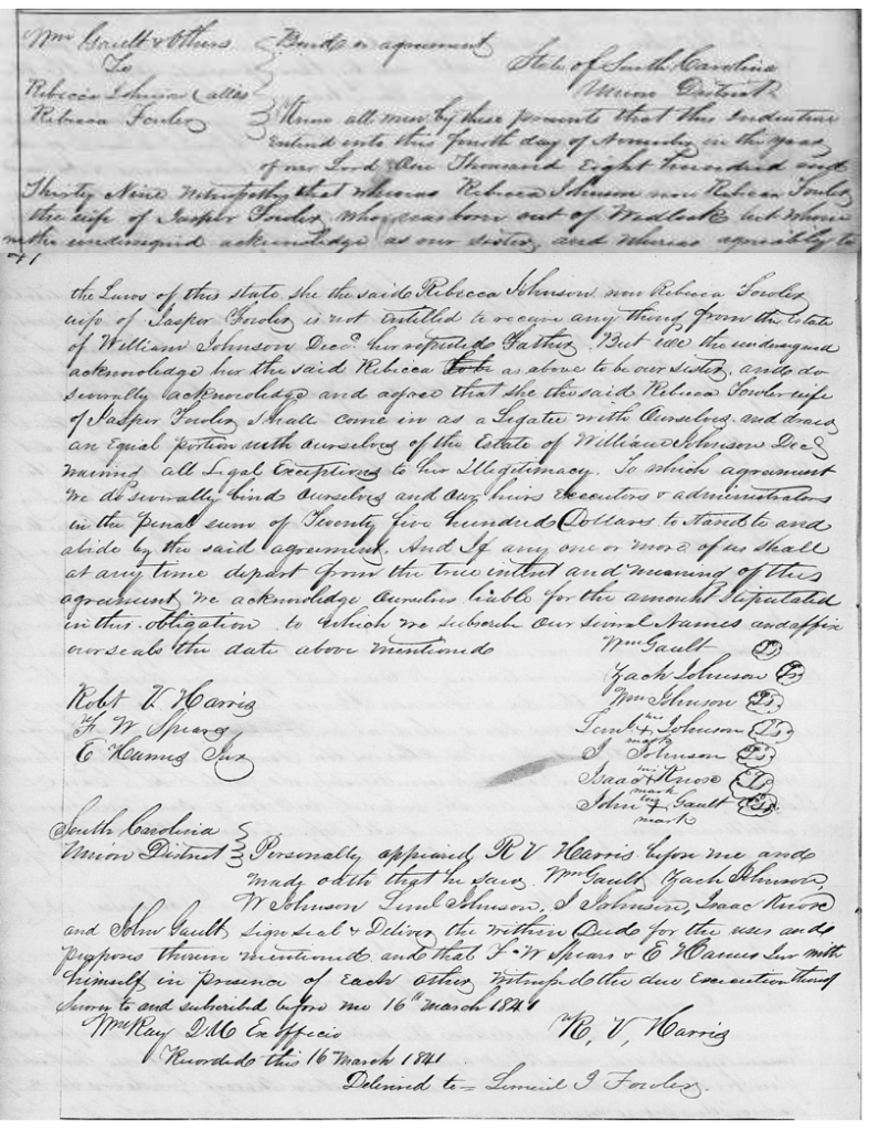 Frances Johnson was born circa 1790/1791. She and her husband William Gault were in the 1810 census, confirming that she was an older child of William and Lois. William Gault signed the document in the third place.