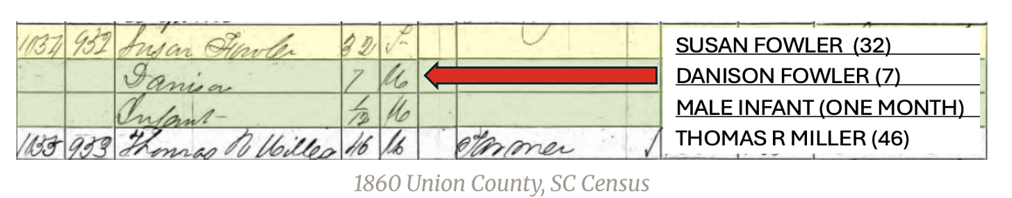 Danison Brown b. 1829 did, in fact, live near Susan Fowler in 1850. I did consider that perhaps he fathered Danison Fowler. After a little research, the possibility went out the window. This Danison Brown had moved to Walker County Georgia circa 1852. He and his wife had several children between 1853 to 1860, all born in Georgia or Mississippi. Danison Brown died in Mississippi in 1909. There is no evidence, real or circumstantial, that he ever moved back to Union County, South Carolina.