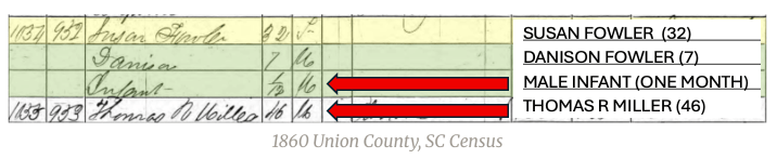 A newborn son, only one-month old, was in the 1860 household of Susan Fowler. Note that the next door neighbor was a man named Thomas R. Miller.