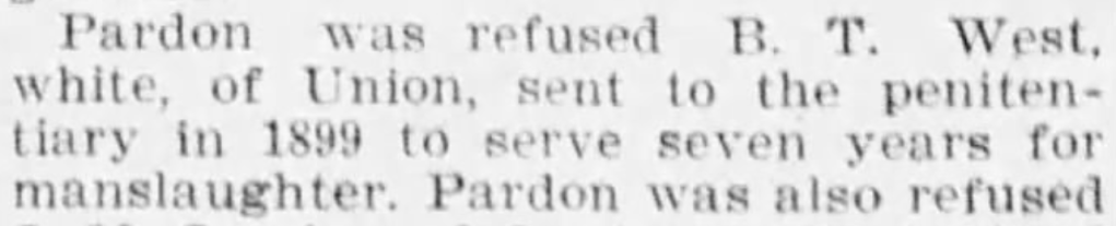 One consolation for Mittie’s family may have been that pardons for his crime were refused by the Governor at least twice, in 1901 and 1904. B.T. West was to serve his seven-year sentence in its entirely.