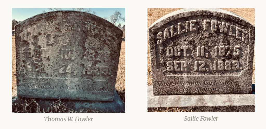 Thomas W. Fowler and his sister Sallie Fowler died twelve days apart. Although the Thomas J. Fowler family had moved from Jonesville to Trough Shoals (Pacolet Mills) after 1880, the children were buried at Gilead in Jonesville near their mother.