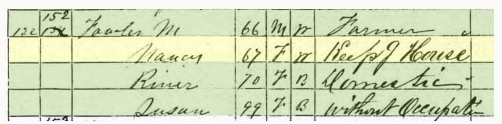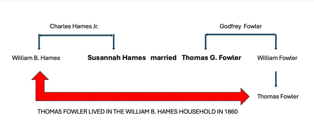 I’ve not found Nancy Fowler in 1860, but Thomas Fowler lived in the household with William B. Hames and family.
