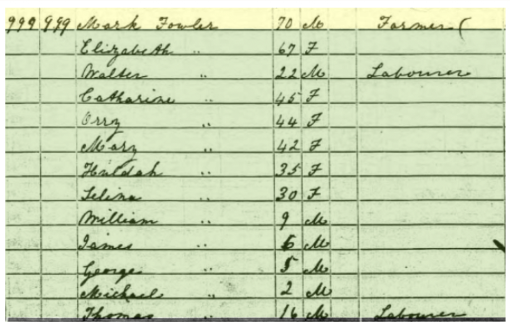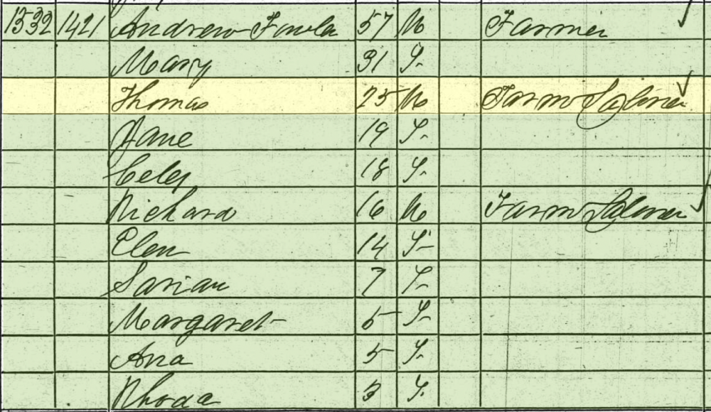 Son Thomas Fowler was fourteen-years old in 1850. His mother Nancy Hames had died and his father Andrew Fowler had married Mary Scisson — the young twenty-nine year old wife in this record.