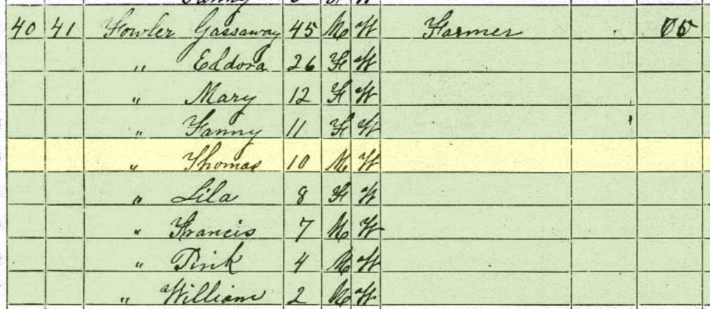 I find no documentation for a son named Thomas Fowler other than the 1870 census record. It is my opinion that the census taker made a mistake in recording the name of the thirteen-year old boy in the household. I believe that the boy “Thomas” was, in fact, Charles Jamison Fowler.