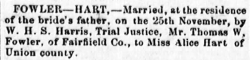 Thomas Fowler lived in Union County through 1830, and moved to Cherokee County, Georgia by 1840. On-line family trees — of which I usually do not give a second glance — have his wife as Bathsheba Cook (1810-1880).