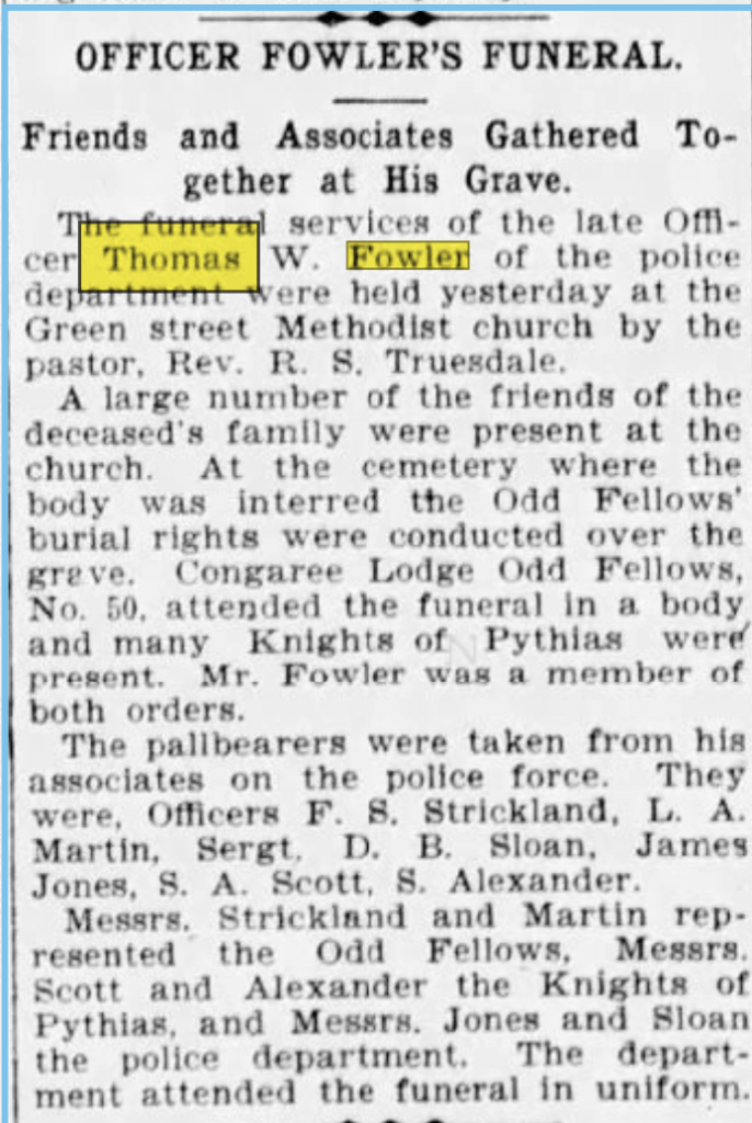 Mary Coleman Fowler had died in 1885, and I find no evidence of a second marriage; it is my thought that the newspaper report was slightly in error, and that the “wife” was a daughter: thirteen-year-old Sallie Fowler (October 11, 1875 and died September 12, 1889).