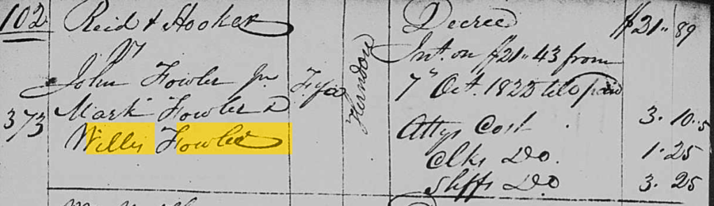 Willis Fowler is found in several legal documents in the early 1800s. The document of 1822 below lists his name with John Fowler, Jr. and Mark Fowler. I am making an assumption that these three men were brothers, all sons of John Fowler “The Elder.”