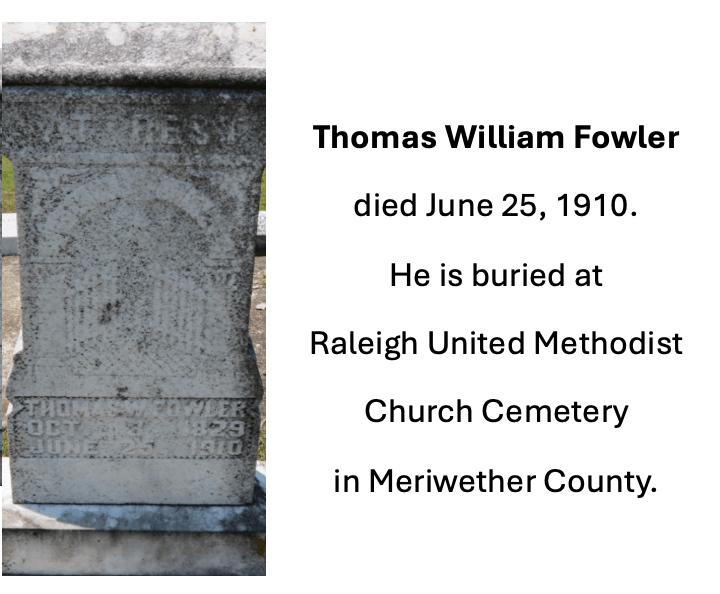Thomas William Fowler — born in 1829 in Union County — was the fifth son of Willis Fowler. A young boy when his family moved to Georgia, Thomas would spend the rest of his life in Meriwether County. He married Cynthia Jane Avery (1838–1902).