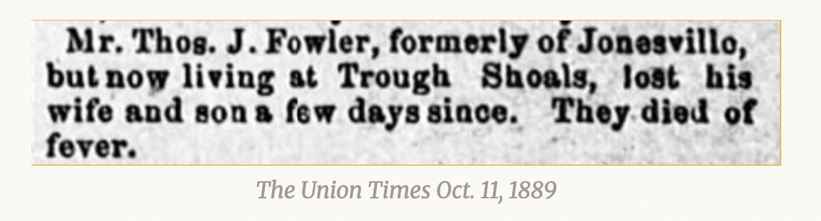 Thomas W. Fowler was fifteen years old at his death. The October 11, 1889 edition of The Union Times had a brief mention that Thomas J. Fowler had lost his wife and son of fever.