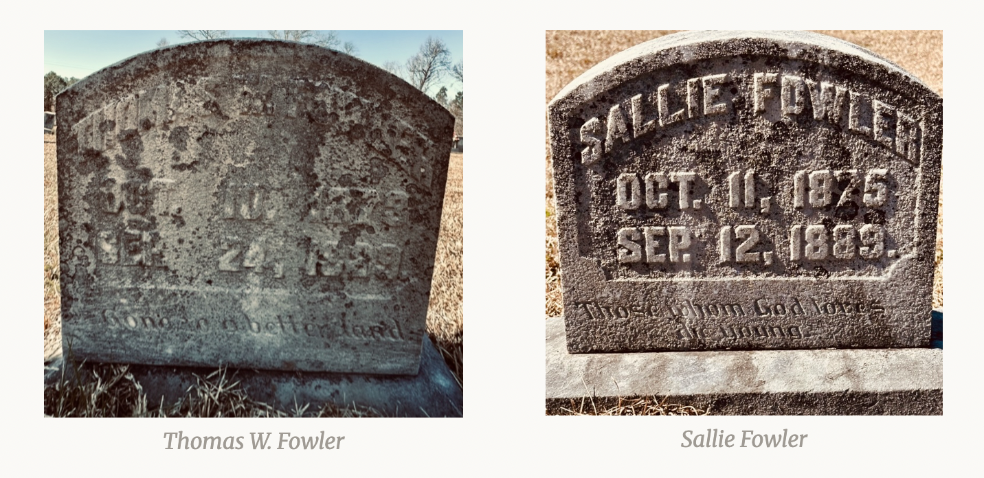 Thomas W. Fowler and his sister Sallie Fowler died twelve days apart. Although the Thomas J. Fowler family had moved from Jonesville to Trough Shoals (Pacolet Mills) after 1880, the children were buried at Gilead in Jonesville near their mother.