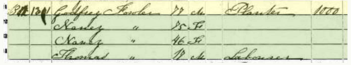 In the 1850 census, Nancy Fowler lived in the household with Godfrey Fowler and wife Nannie. There was also a 17 year old young man named Thomas Fowler in the household.