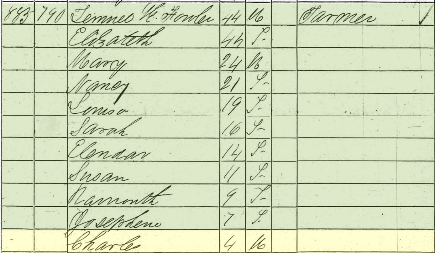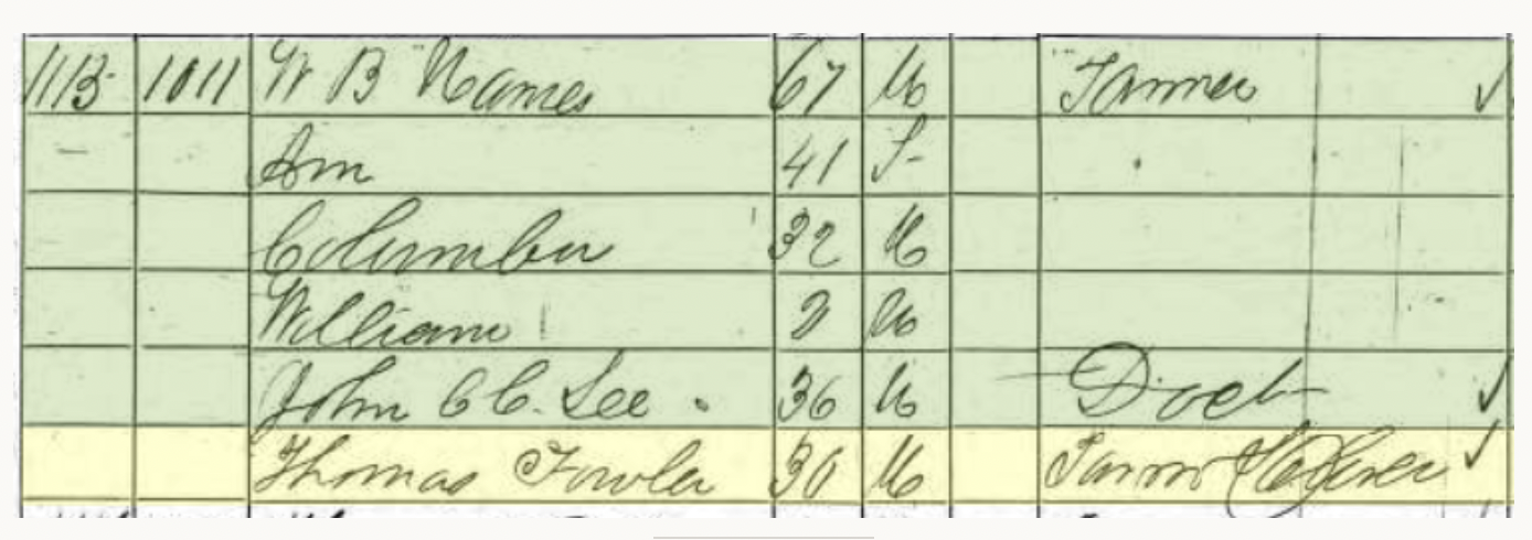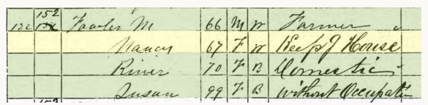 I’ve not found Nancy Fowler in 1860, but Thomas Fowler lived in the household with William B. Hames and family.