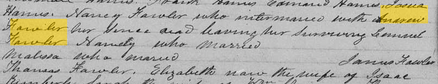 “Nancy (Hames) Fowler who intermarried with Andrew Fowler, her since dead having her surviving Lemuel Fowler; Nancy who married ______; Malissa who married _____; James Fowler; Thomas Fowler “