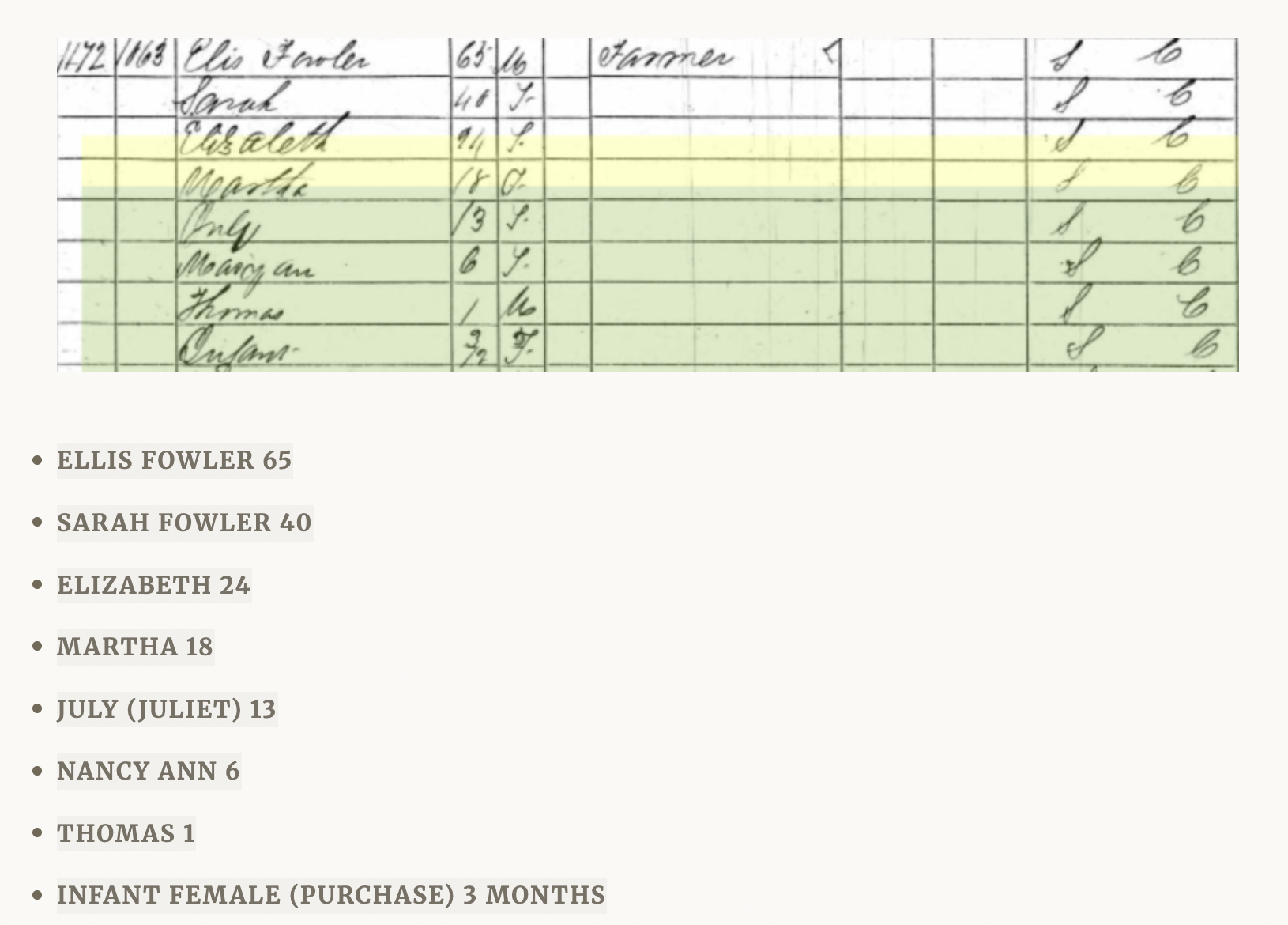 Ellis Fowler may have had a first wife who died young. By 1841, he was married to Sarah Clark (daughter of Winnifred Clark) and they had children: