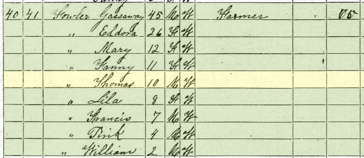 I find no documentation for a son named Thomas Fowler other than the 1870 census record. It is my opinion that the census taker made a mistake in recording the name of the thirteen-year old boy in the household. I believe that the boy “Thomas” was, in fact, Charles Jamison Fowler.