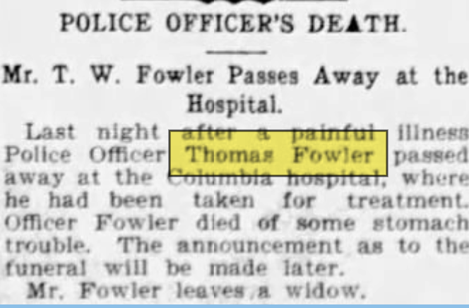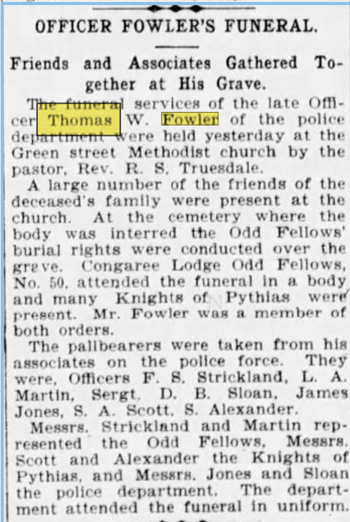 Mary Coleman Fowler had died in 1885, and I find no evidence of a second marriage; it is my thought that the newspaper report was slightly in error, and that the “wife” was a daughter: thirteen-year-old Sallie Fowler (October 11, 1875 and died September 12, 1889).