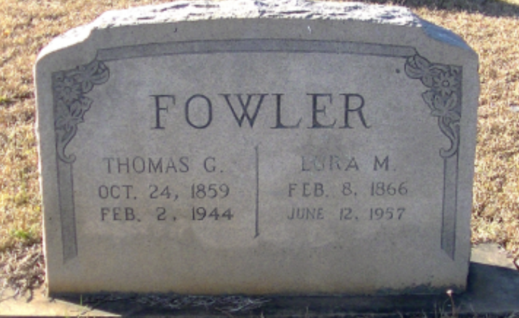 Thomas Gillman Fowler died on February 2, 1944, and was laid to rest at Gillead Baptist Church cemetery on February 4. His wife Lura Mabry Fowler, mother of his seventeen children, died June 12, 1957.